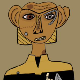 Pel || Star Trek / canon / DS9 || Pel is a Ferengi who has been disguising themself as a man in order to do business and live a life outside their society's rigid laws. They get a post as a waiter at Quark's, quickly becoming one of his close friends and confidants. But when their true identity is discovered, they're forced to strike out on their own to build a new life for themself.