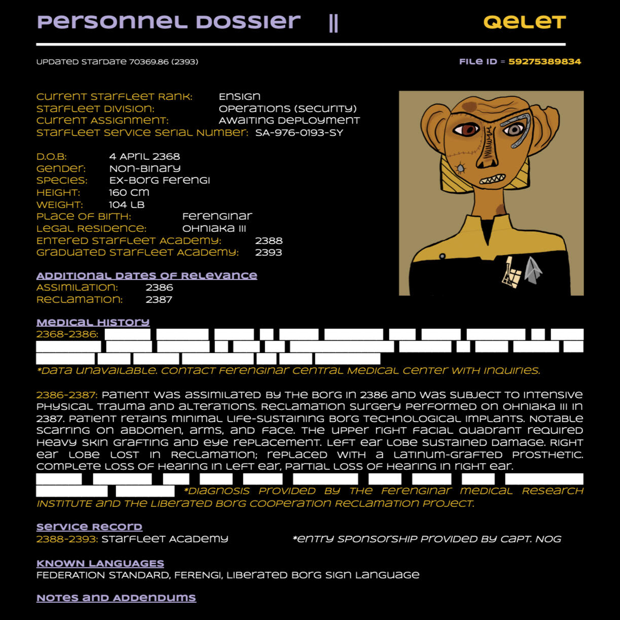 Qelet || Star Trek / oc / pre-PIC || Qelet is a Ferengi who was assimilated by the Borg in 2386. Upon their reclamation a year later, they spent time on Ohniaka III trying to figure out what they wanted to do next, and finally entered Starfleet Academy in 2388. They're now an ensign security officer. *REQUEST ONLY
